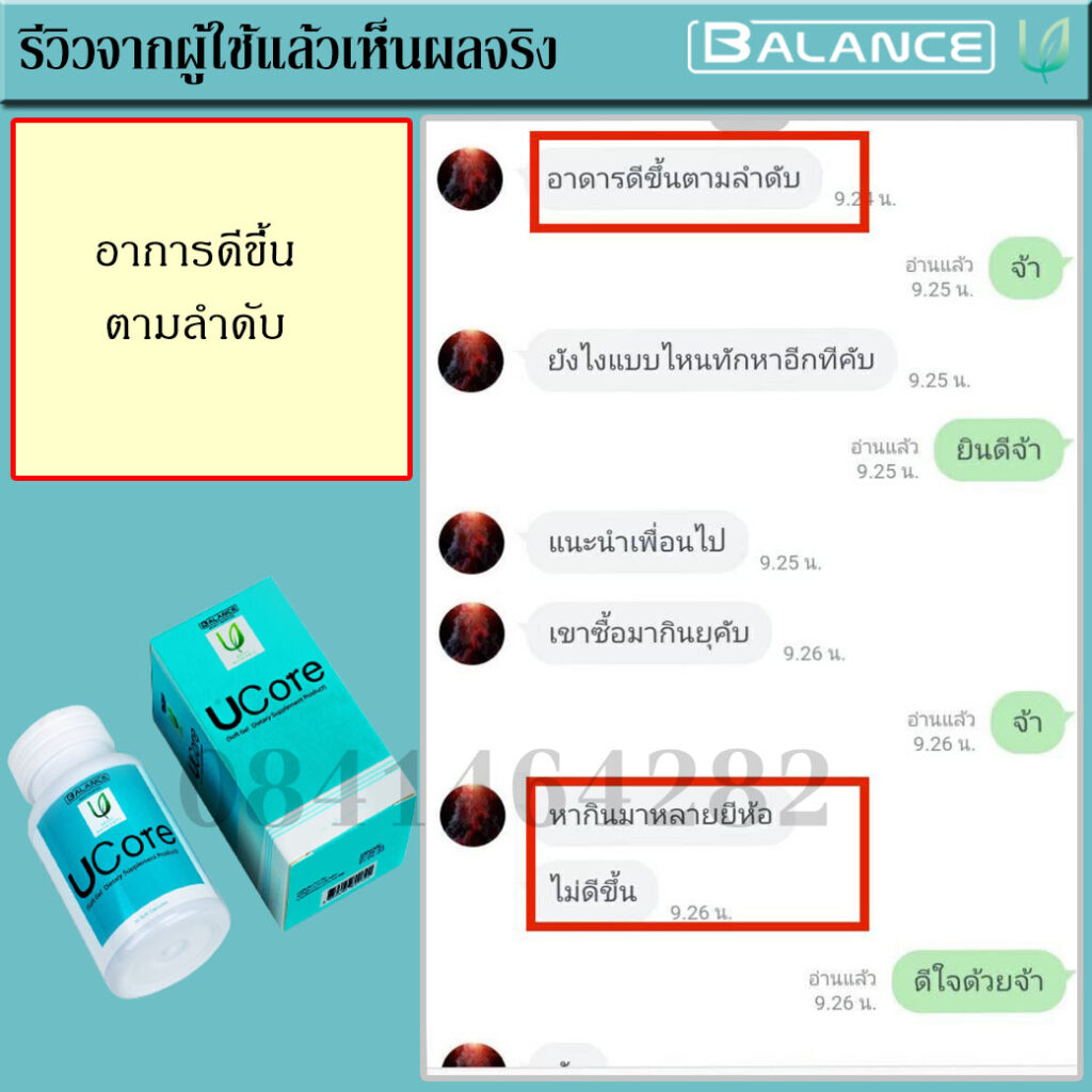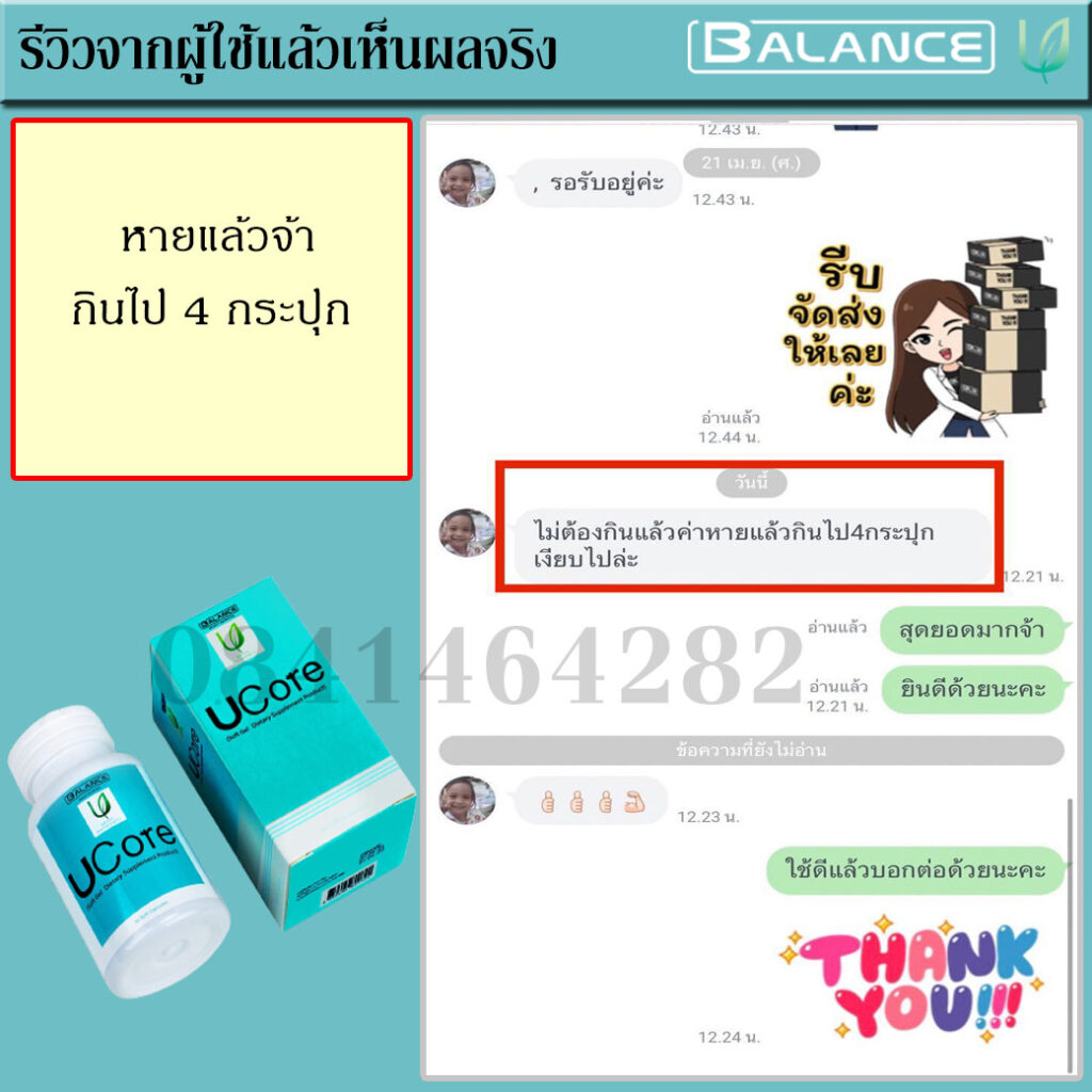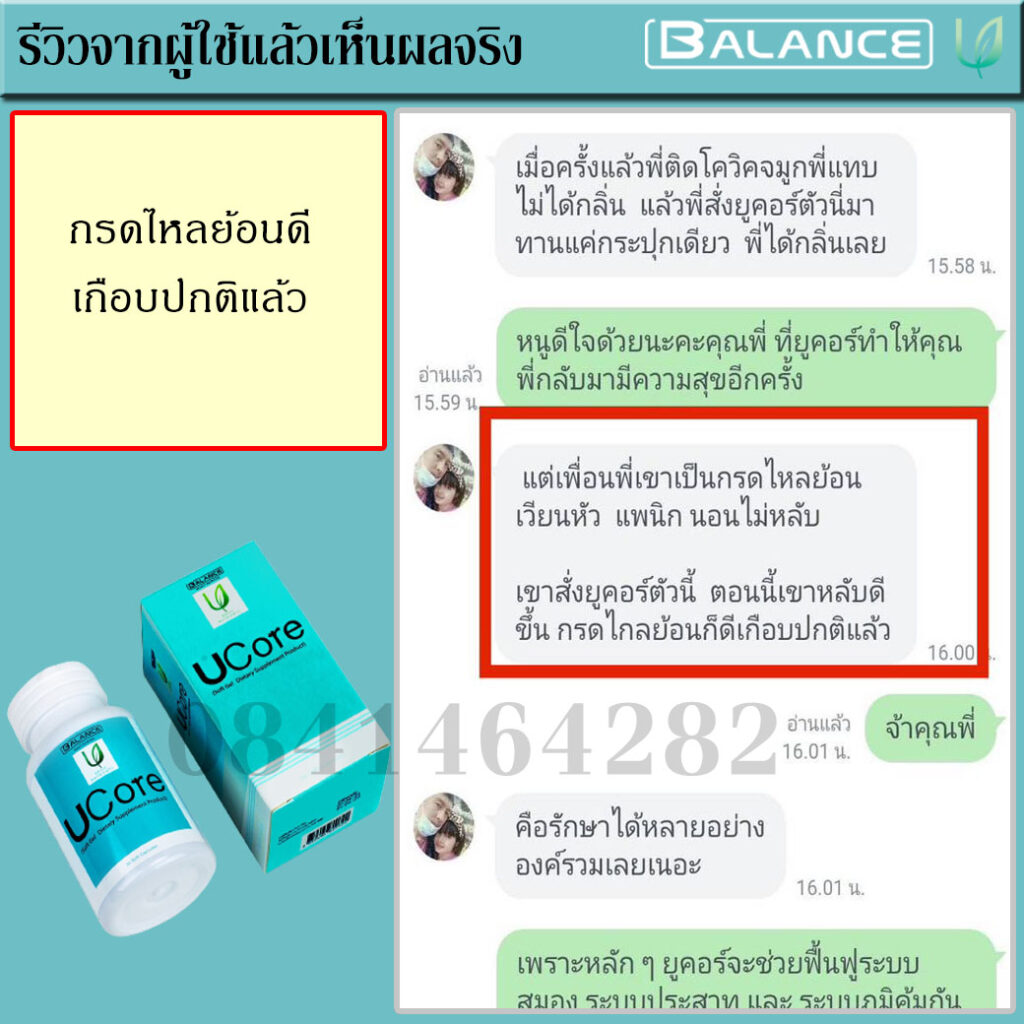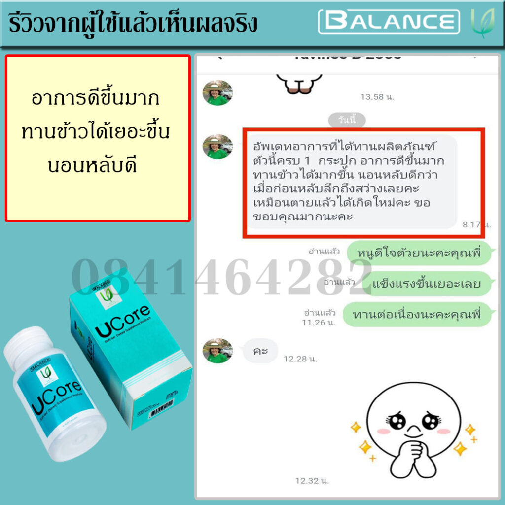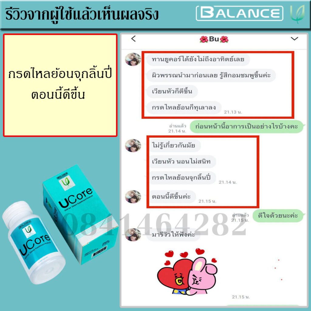 จนวันนึงเพื่อนมาเที่ยวหาที่บ้าน จึงเล่าอาการที่เป็นอยู่ให่ฟัง เพื่อนบอกว่ามี พี่ที่ทำงานเคยเป็น พี่เขาก็เล่าว่าเคยรักษามาหลายวิธีทั้งกินยาทั้งการปรับพฤติกรรมในการดำเนินชีวิต จนกระทั่งมาเจอผลิตภัณฑ์ยี่ห้อ บาลานซ์ ยูคอร์ ( Balance Ucore ) ช่วยยับยั้ง แก้อาการ ตอนนี้กลับมาใช้ชีวิตและทำงานได้ปกติเหมือนเดิมแล้ว